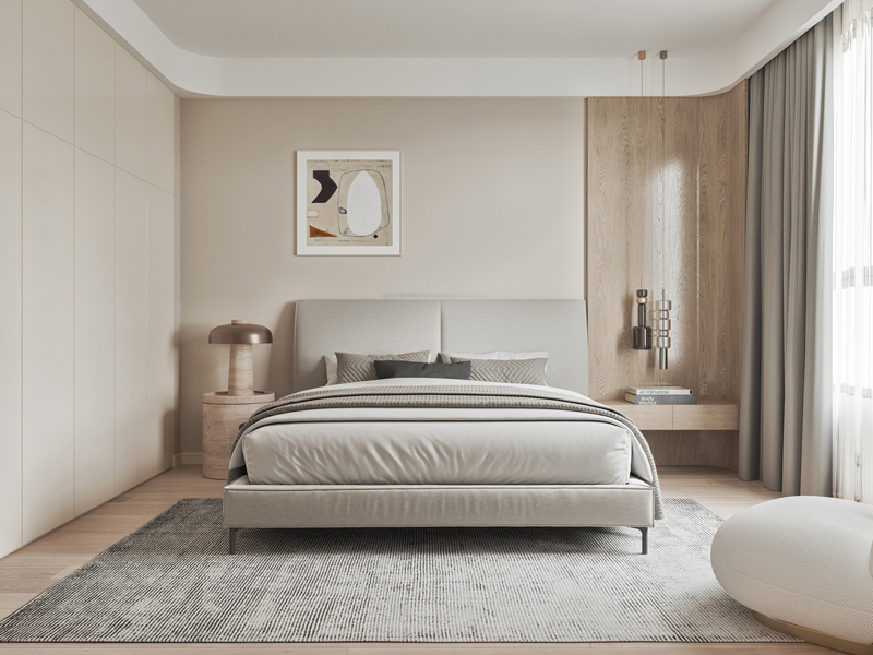 卧室兼具功能性与美观性,简洁的技术设计搭配装饰画与创意床头灯,营造出精致温馨睡眠氛围。