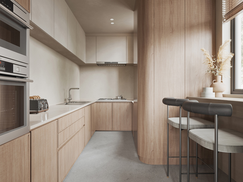 厨房多用木质设计,让烹饪环境整体视觉非常自然舒适,U形布局保证了收纳需求,提升空间利用率。