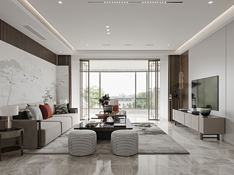 客厅区域大气明朗,保留了原有阳台,采用通透的推拉门设计保证采光,背景墙水墨画与格栅设计韵味十足。