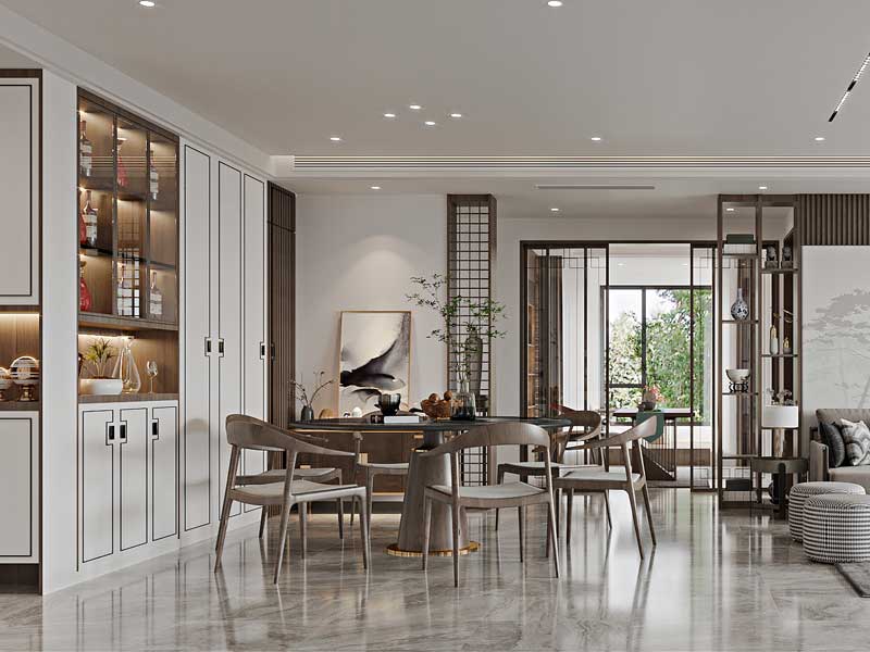 餐厅区域布局餐边柜,日常使用便捷舒适,满足置物需求,实用性更强,采用开放式设计,就餐氛围更浓郁。