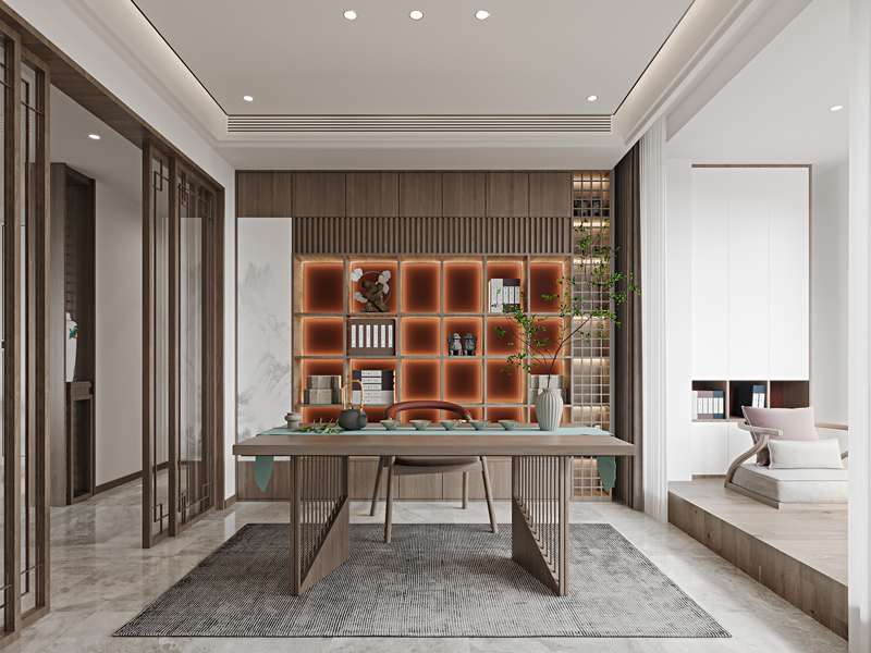 书房区域兼具茶室与阅读的功能,背景墙合理安排储物置物区域,设计上富有设计感,提升区域时尚氛围。