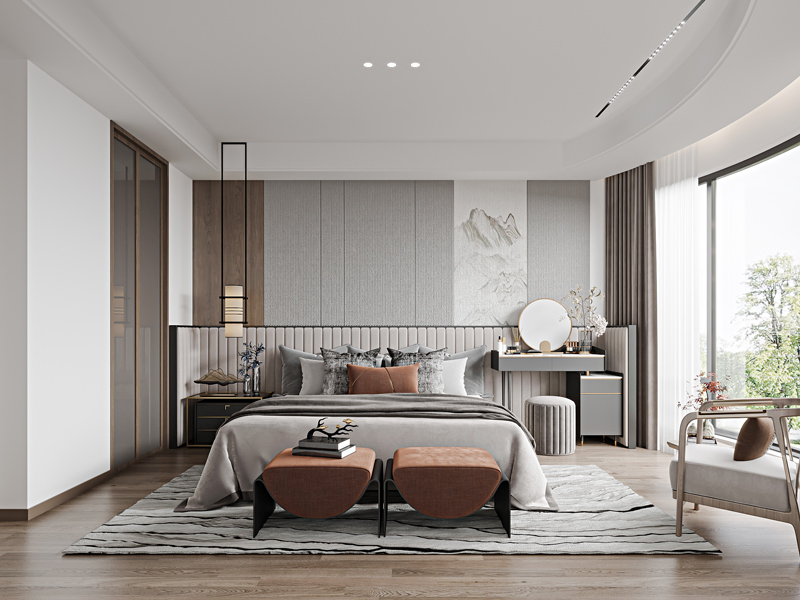 卧室时尚感很强,头将梳妆台与床头柜整体围绕起来,让睡眠安全感更强,大面积落地窗增进自然采光。