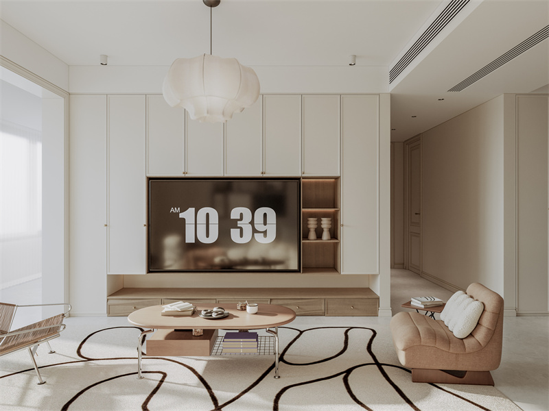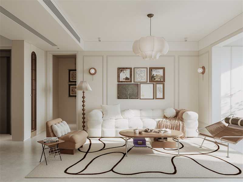 以柔和的米色为主调,搭配艺术感地毯与装饰画,营造出温馨且具艺术感的氛围。整体布局宽松舒适,注入设计感,打造出让人放松的休闲空间。