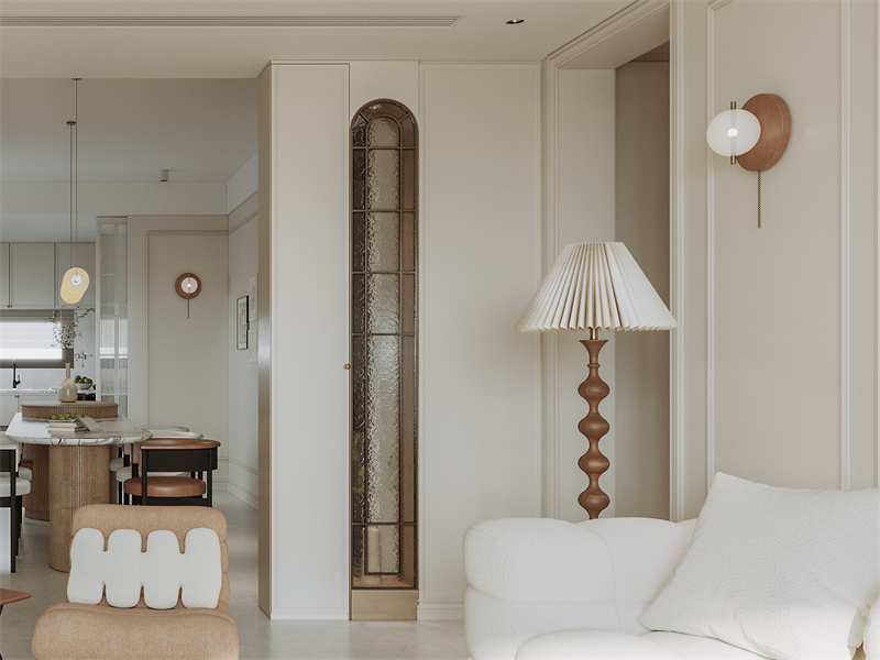 以柔和的米色为主调,搭配复古玻璃门与精致灯具,营造出温馨雅致的氛围。独特造型的落地灯与舒适的座椅,为空间增添了休闲感,同时作为空间过渡区域,既起到了分隔作用,又保持了空间的通透与连贯,精致且具层次感。