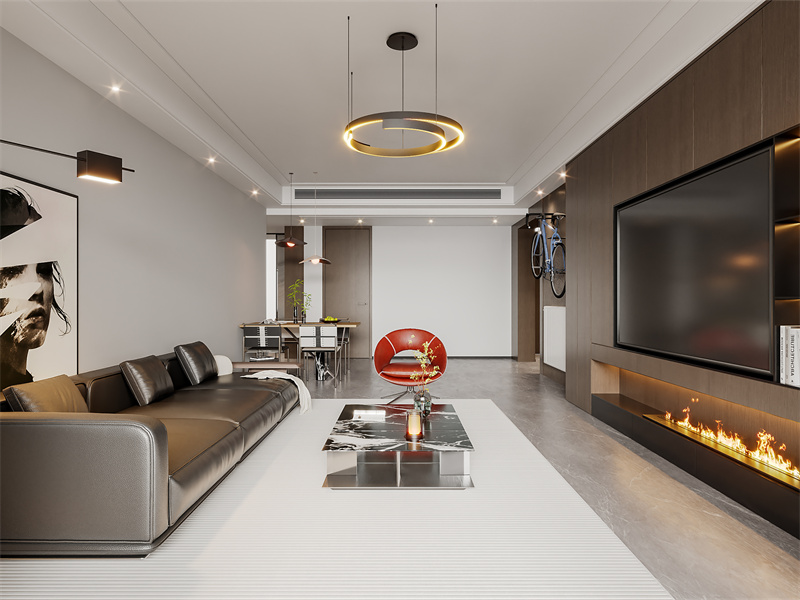 客厅延续现代风格,深棕柜体与黑色大理石茶几,悬浮电视墙结合壁炉元素,增添温暖氛围,自行车挂饰彰显个性,灯光层次丰富,整体空间时尚且有温度。
