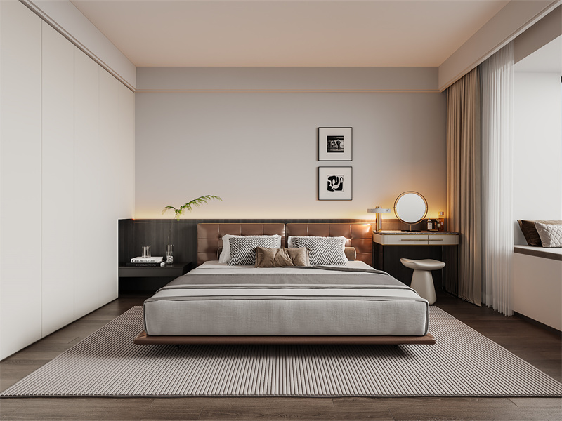 卧室采用柔和的浅色调,营造静谧休憩氛围。悬浮床设计简约现代,床头背景墙的灯光提升温馨感。大面积衣柜满足收纳需求,梳妆台与圆形镜搭配,方便日常使用。