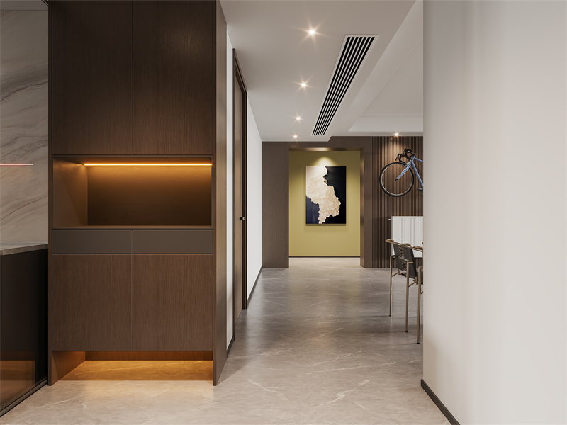 利用深棕柜体做收纳与展示,灯带设计提升氛围感。地面通铺大理石瓷砖,延伸空间感,让玄关区域空间也充满设计细节,整体简洁又不失品味。
